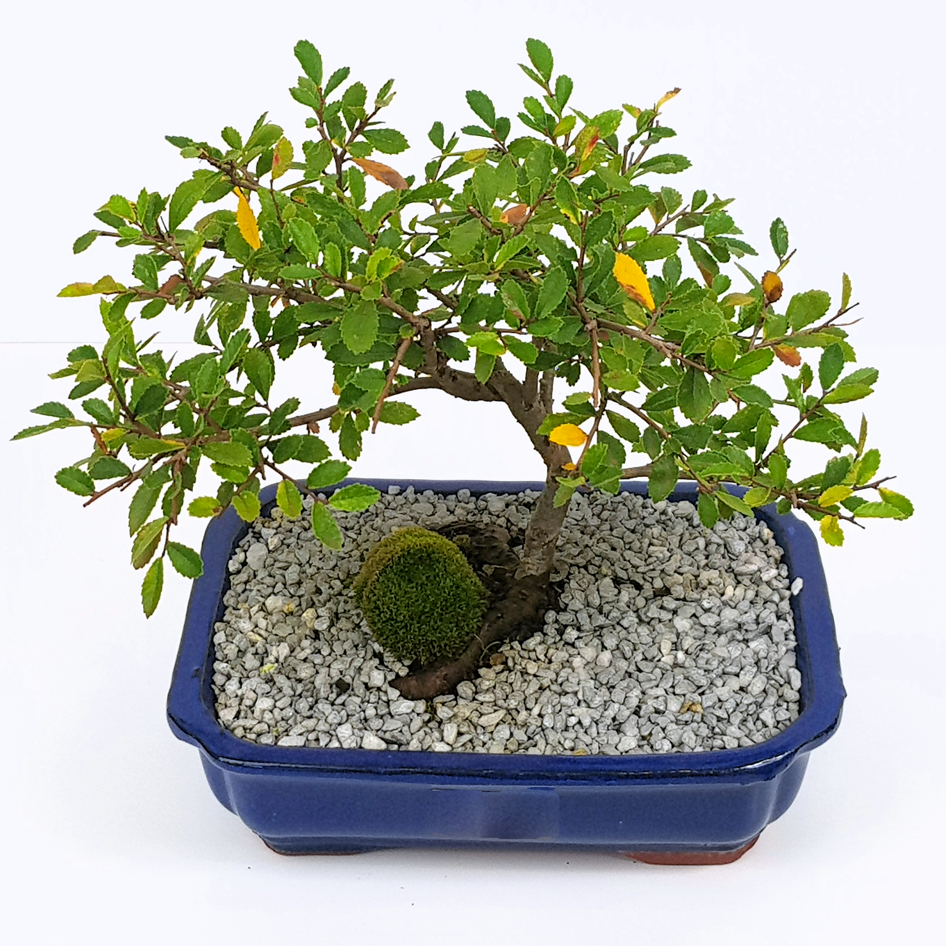 Broom style Chinese Elm in a glazed navy blue pot.