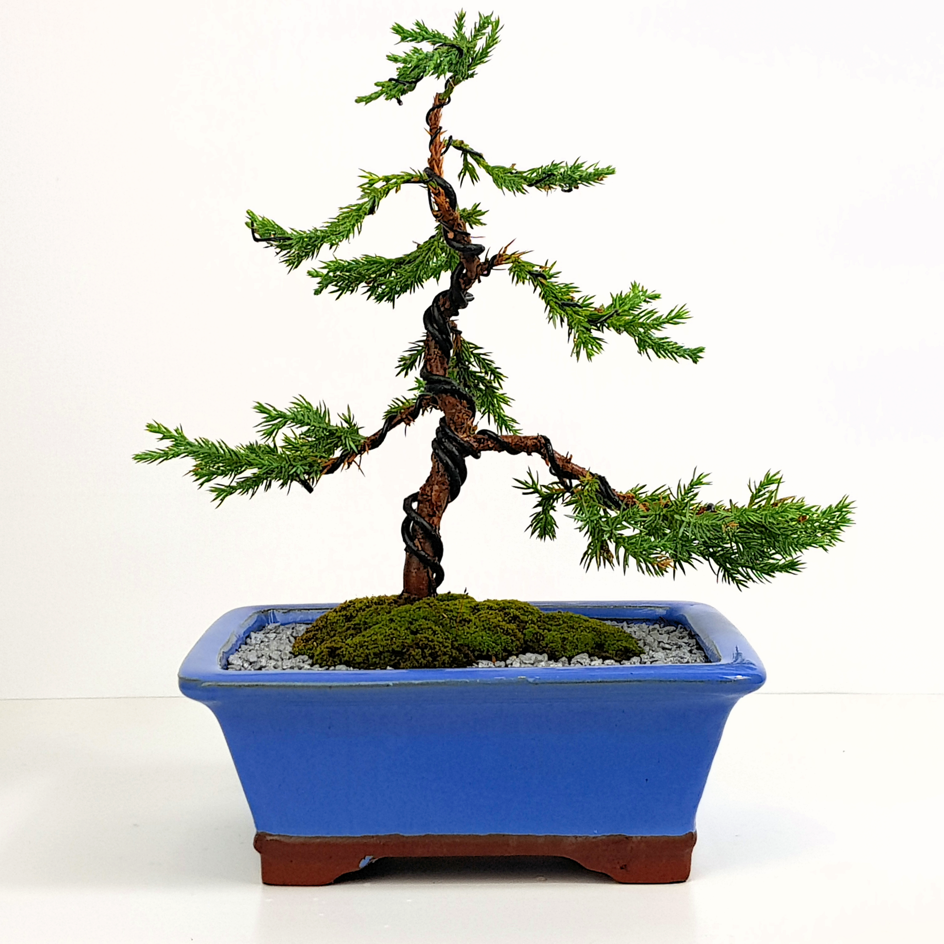 Informal upright Chinese Juniper in a glazed lilac pot.