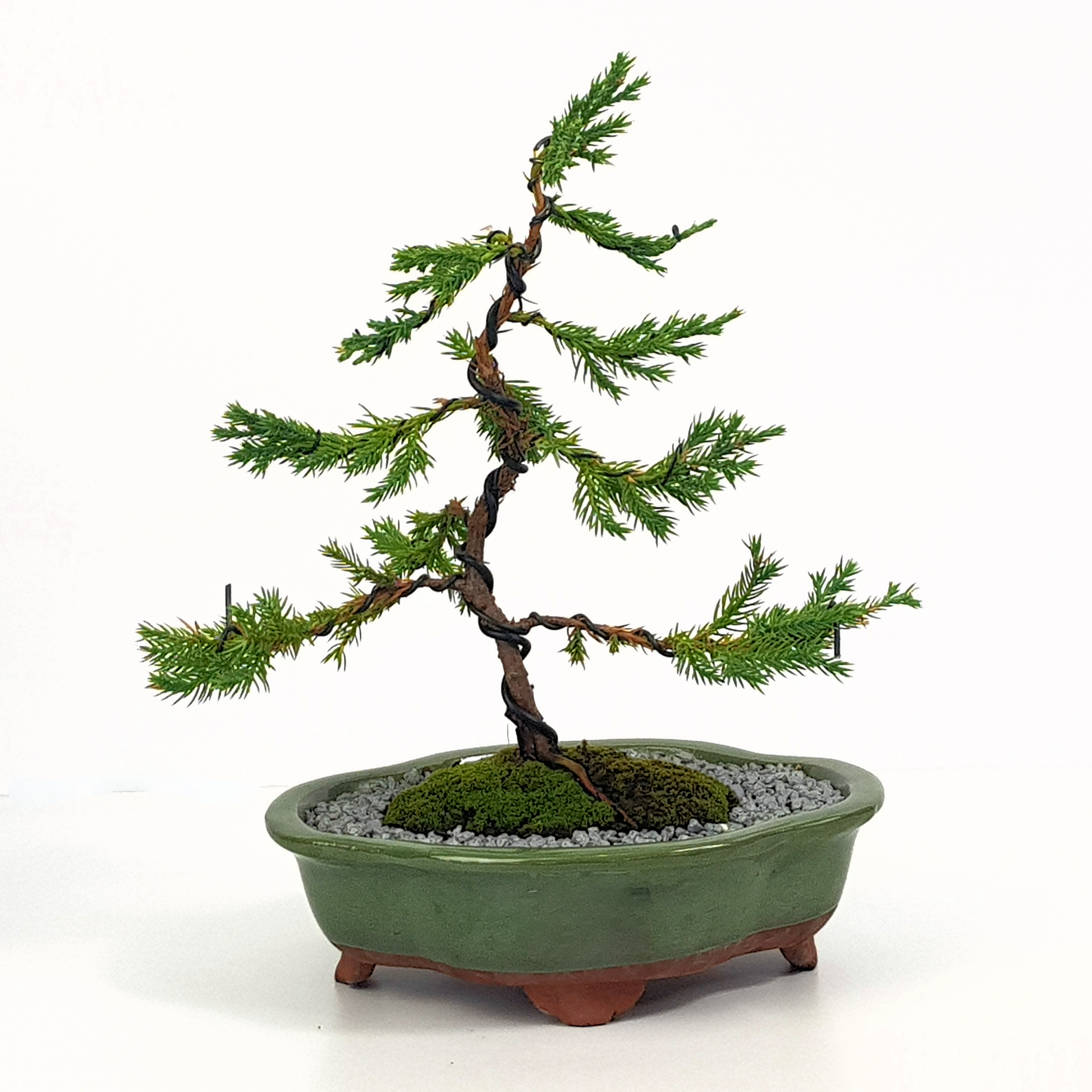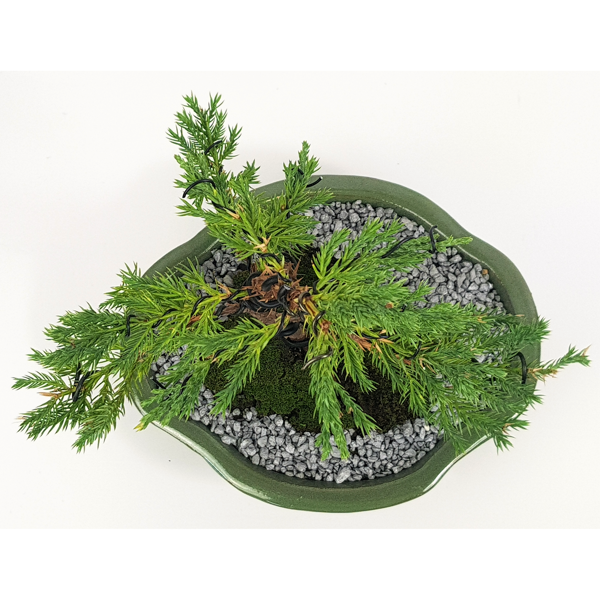 Informal upright Chinese Juniper in a glazed lilac pot.